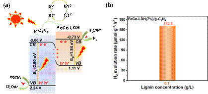2 (a) FeCo-LDH/g-C3N4纳米复合材料的光催化产氢机理图; (b) 光催化重整木质素制氢性能