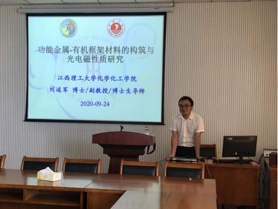 2020年9月24日上午,江西理工大学化学化工学院副院长、副教授,博士生导师刘遂军来九色视频 作题为《功能金属-有机框架材料的制备与光电磁性质研究》的学术报告。