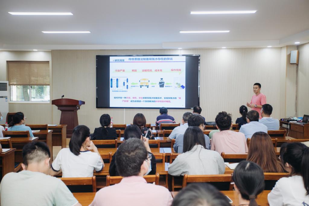 曹勇勇博士作题为《电催化合成双氧水的理论模拟—从催化剂的设计到反应机理的揭示》报告,介绍了应用于精细化工领域绿色、环保、高效的双氧水(H2O2)新合成方法,提出利用可再生电力通过电催化氧还原(ORR)技术在现场制备H2O2为实现该目标提供了新思路,采用多尺度模拟方法实现电催化合成双氧水催化剂设计和反应机理的揭示都具有重要意义。三位报告人还就相关科研成果与师生进行了交流互动,会场气氛热烈。