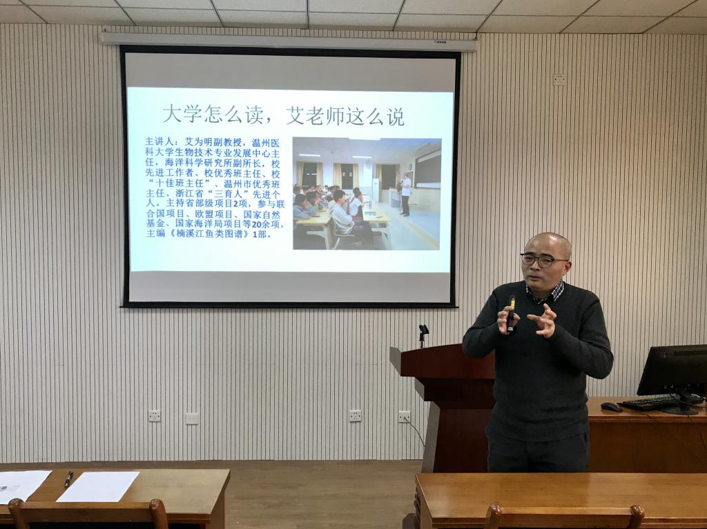 12月4日下午,温州医科大学生物技术专业发展中心主任海洋科学研究所副所长艾为明副教授来九色视频 作题为《大学怎么读,艾老师这么说》的学术报告。