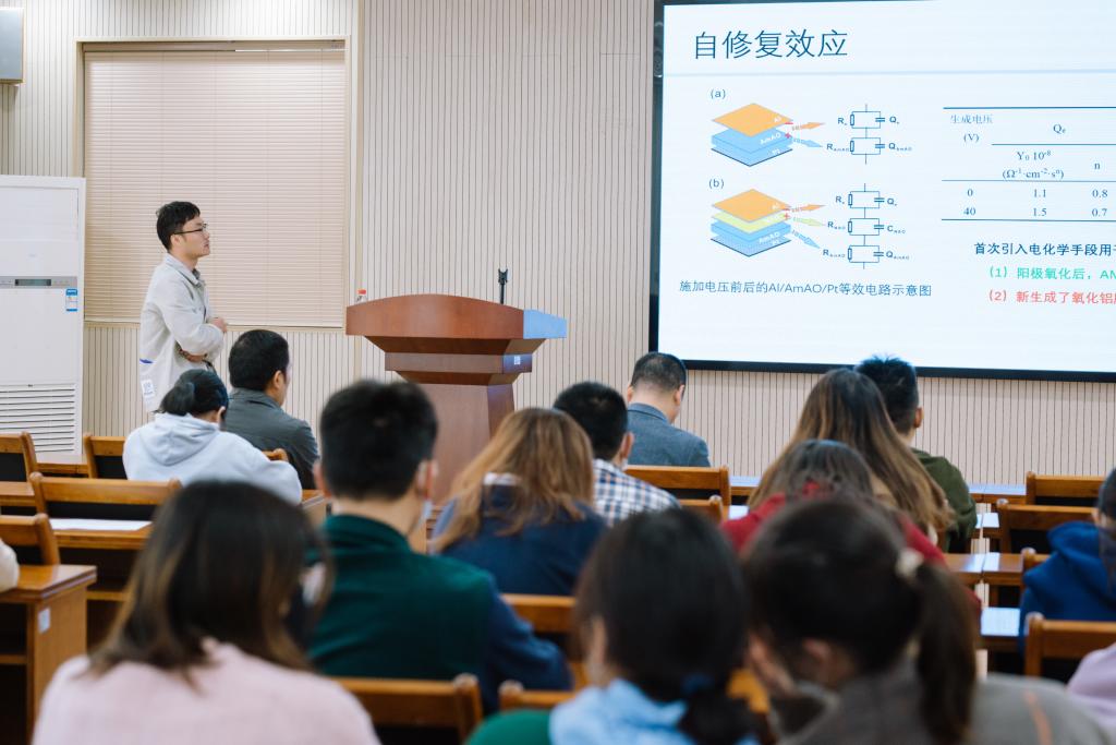 苏振博士主讲题目为《新型自愈合电介质电容器的制备及应用》,主要从电介质电容器自愈合效应方面进行阐述。他强调指出电介质电容器具有超高的功率密度和耐压强度,是脉冲功率设备不可或缺的核心组件,也是电子电路中不可缺少的元器件,然而在实际应用中,电介质电容器仍存在储能密度低、击穿场强低、制备工艺复杂等问题。电介质电容器中自愈合效应的发现为有效解决上述问题提供了新的思路。