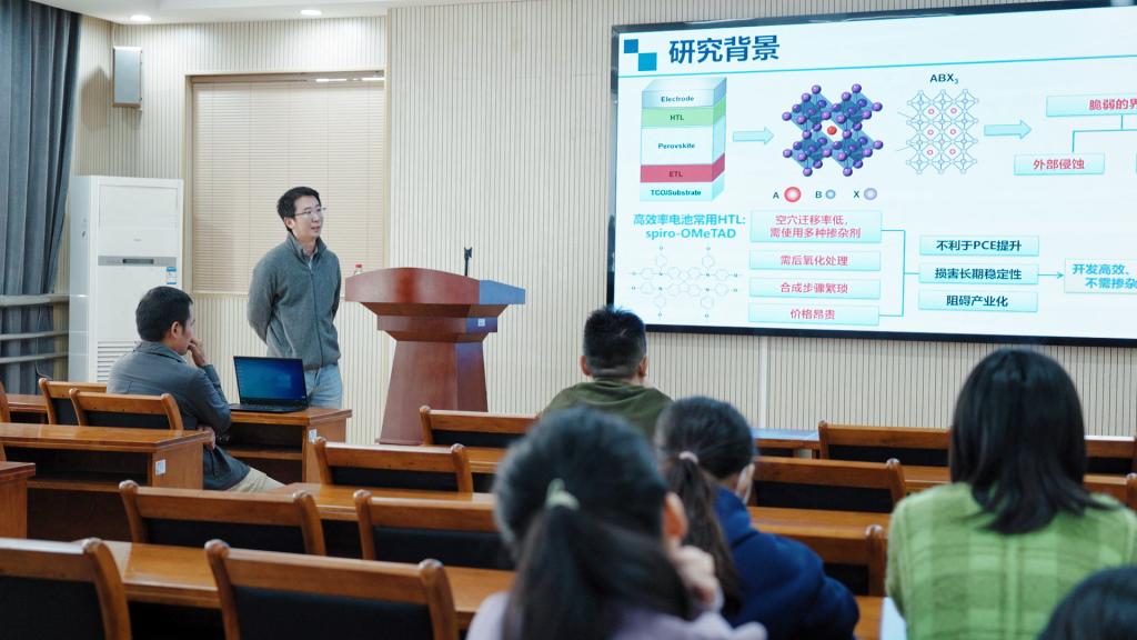 尹新星博士主讲题目为《高效稳定的钙钛矿太阳能电池界面材料研究》,主要阐述了界面对于提高钙钛矿太阳能电池的效率和稳定性具有关键性影响。本报告聚焦钙钛矿电池界面中的空穴传输和缺陷钝化,从材料设计与合成出发,揭示材料结构与性能的内在关系,实现电池效率和稳定性的提高,助力钙钛矿太阳能电池产业化进程。