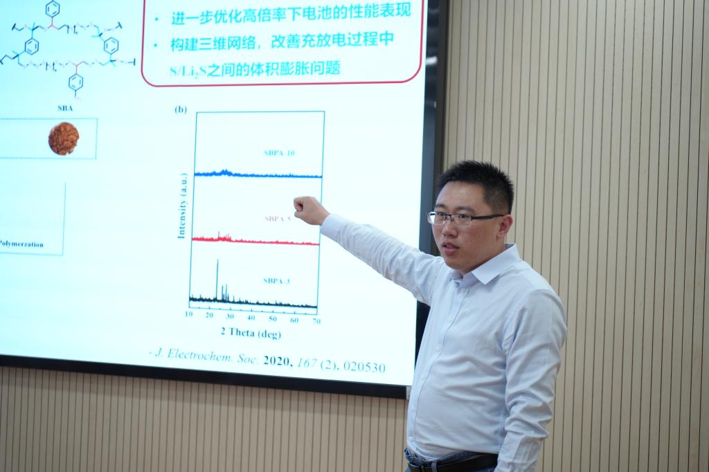 王鹏副教授主讲题目为《导电富硫共聚物的设计及在锂硫电池中的应用》。他重点介绍了基于动态共价聚合技术制备的导电富硫共聚物复合材料,表示将其应用于锂硫电池中,可以缓解现阶段锂硫电池运行过程中普遍存在的因多硫化锂来回穿梭导致的严重的“穿梭效应”以及硫电化学动力学缓慢等问题。