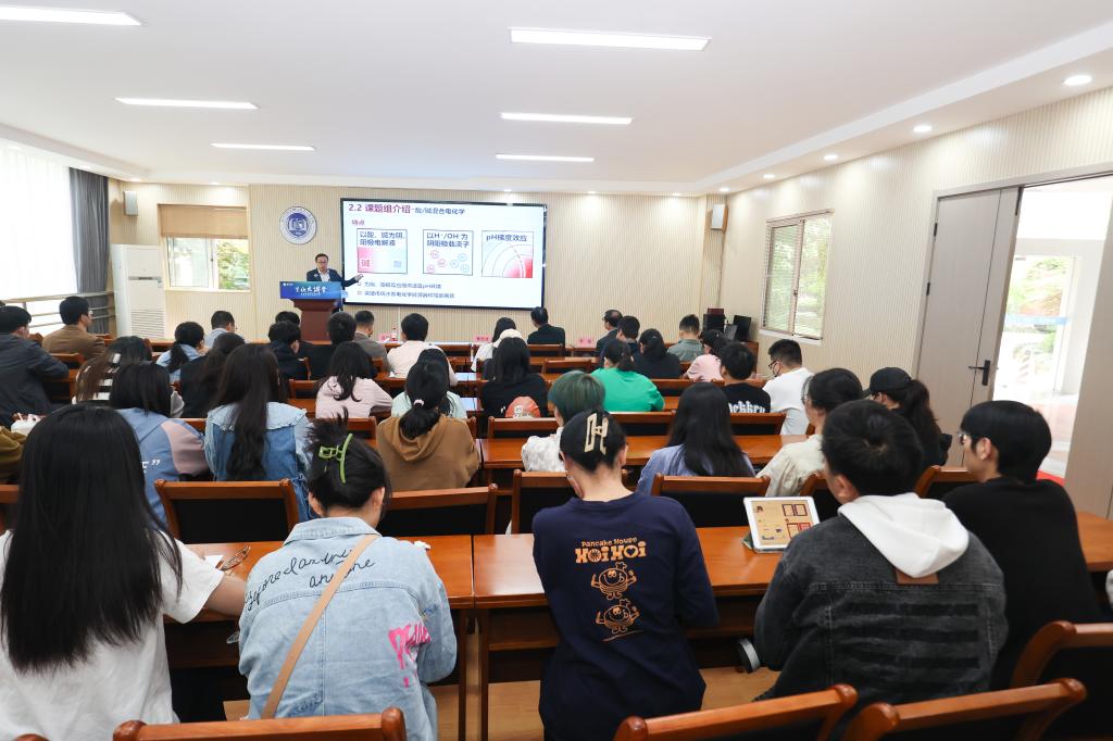 温珍海研究员首先阐释了电化学能源体系中的2个关键科学问题即电能与化学能相互转换过程中存在的阴/阳极电化学热力学性质与动力学速率不协同问题/阳极还原氧化反应各自适宜介质差异问题。围绕以上问题,温珍海研究员着重介绍了其领衔的课题组近期做的三方面工作:一是通过构建不同的电化学性质离子为阴、阳极载流子的混合电化学能源体系,协调阴/阳极电化学反应的媒介环境,提升活性物质分子电极反应的热力学活性和动力学速率,从而显著提高了相关电化学能源器件的性能;二是通过设计构建阴/阳极之间具有pH梯度的混合电化学合成体系,既优化了阴/阳极反应的介质环境,又能通过利用电化学中和降低电化学合成过程中的电耗;三是开发了以不同离子为载流子的水系电池和有机电解液电池,突破了传统电池电化学工作电压窗口限制瓶颈,显著提高了电池的工作电压和功率密度。报告结束后,在场师生踊跃提问,温珍海研究员耐心地解答了师生们提出的问题,现场气氛热烈。