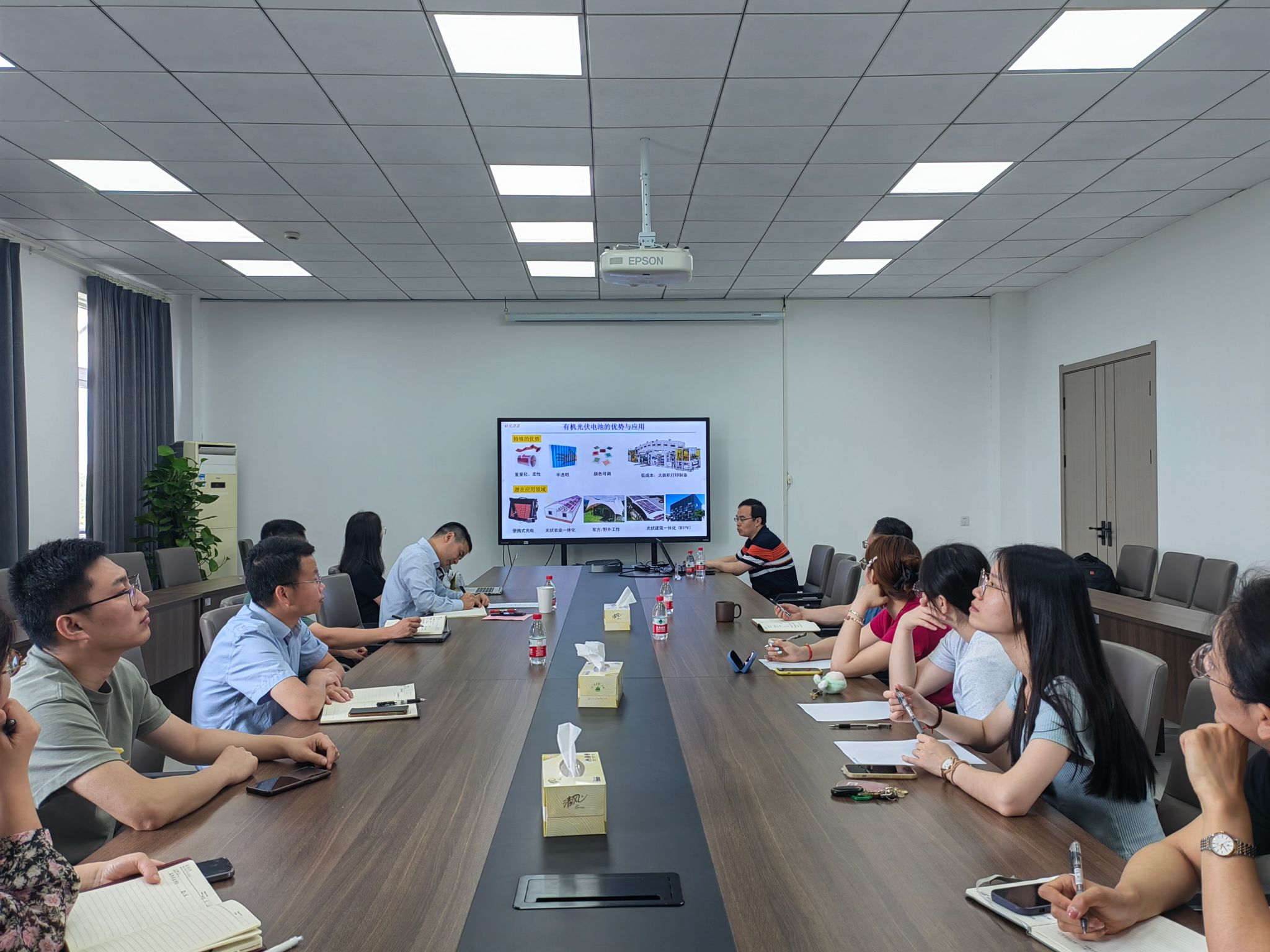 周二军研究员在报告中介绍了有机光伏电池的研究现状及应用前景,分析了当前有机光伏电池存在的主要挑战及未来的发展方向,并重点就其领衔的课题组在高开路电压有机光伏电池研究上所开展的工作进行了介绍,包括有机光伏电池材料设计策略、器件优化工艺、机理研究以及在三元、叠层、室内弱光等方面的应用情况。在互动交流环节,与会教师踊跃提问,周二军研究员耐心地解答了老师们提出的问题,并就相关问题进行了深入的交流讨论,现场气氛热烈。