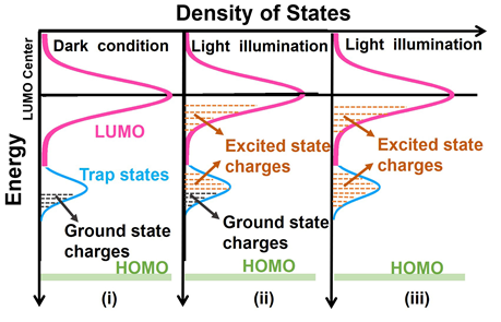 图1.(i)为暗态下,基态电荷填充陷阱态能级的示意图;(ii)为有基态电荷占据陷阱态能级情况下,光激发态电荷填充能级的示意图;(iii)为没有基态电荷占据陷阱态能级情况下,光激发态电荷填充能级的示意图。
