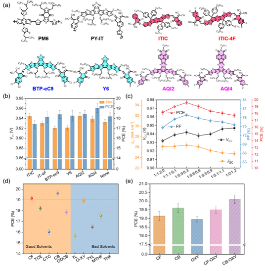 研究结果表明,引入AQI4可以有效地提升器件的性能,使用CB为溶剂, PM6:PY-IT:AQI4 (1:0.9:0.3)的三元器件达到了19.6%的PCE。同时,使用CB:OXY(3:1)混合溶剂加工的小面积器件(5.2 mm²),实现了创纪录的20.1% PCE(经国家光伏产业计量测试中心(NPVM)认证效率为19.5%),同时获得了高达80.1%的FF。