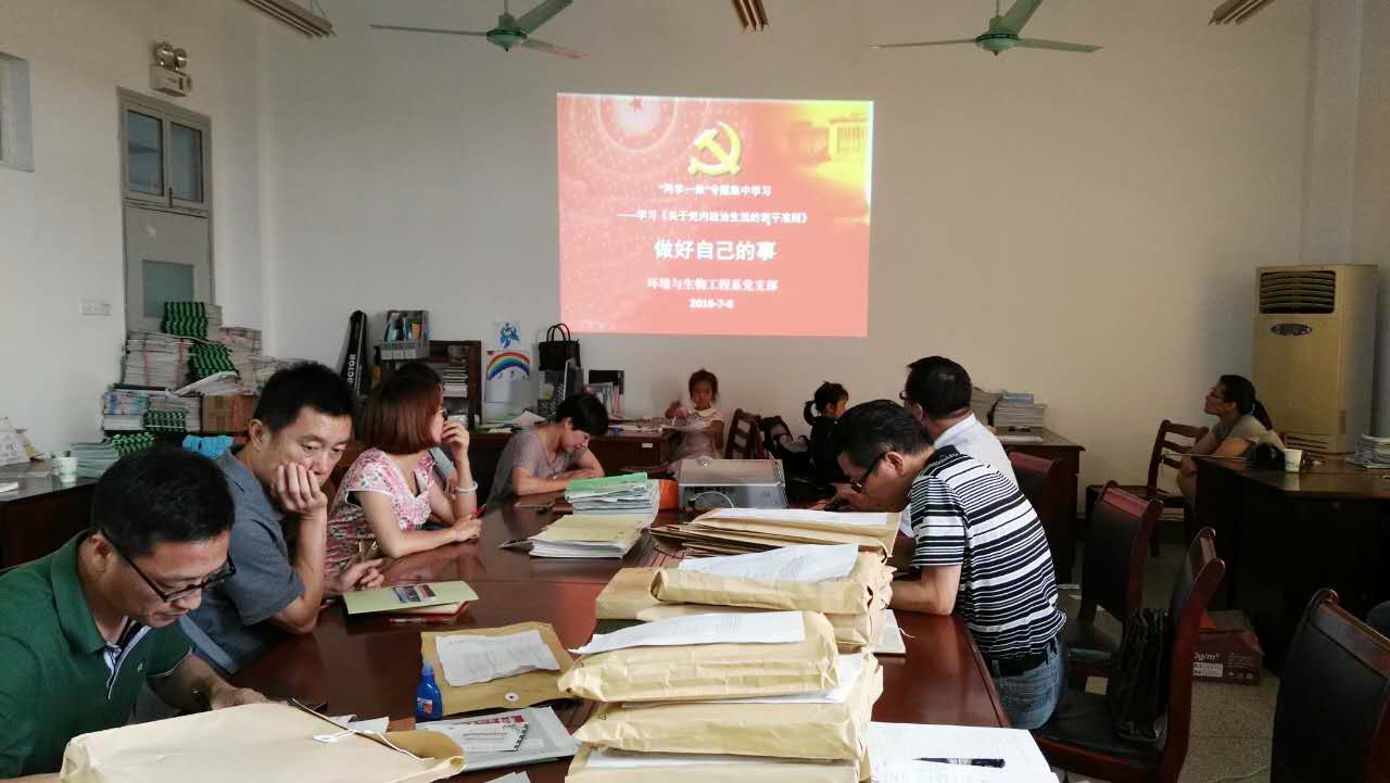 支部全体党员认真学习《准则》相关内容并进行了深入交流与讨论,随后,环生系系主任翟志才同志带领大家集体学习了“习近平总书记在庆祝中国共产党成立95周年大会上的重要讲话”精神,简要阐述了讲话的主要内涵和精神实质,希望全体党员教师在日常工作中能发扬“工匠精神”“钉钉子精神”。此外,翟老师还结合目前环生系专业发展面临的挑战谈了自己的看法,并指出环生系党支部全体党员应该通过此次教育活动,要在行为上有对照、思想上有触动,在日后的工作中能做出表率,敢担当、敢做事,为专业发展做出贡献。