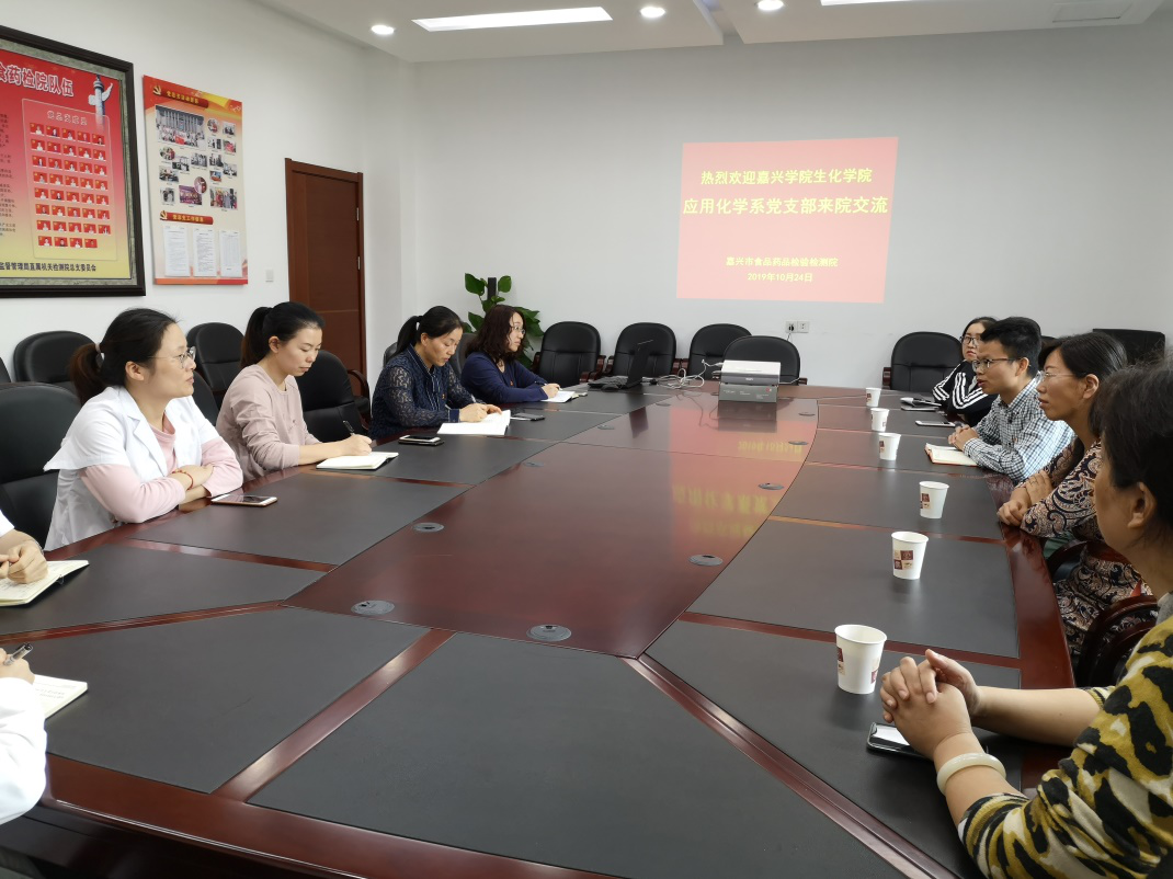 首先,宾主双方各自简要介绍了单位或专业情况以及不忘初心、牢记使命主题教育活动安排。然后围绕如何利用专业实习机会,更好地培养应化专业本科生的实践动手和解决分析问题能力进行了深入交流和探讨,在实习工作的组织形式、时间安排、过程评价等方面达成了广泛共识。随后,应用化学系党支部代表全体应用化学专业师生对嘉兴市食品药品检验检测院长期以来对九色视频 应用型人才的培养提供的支持和帮助表示衷心的感谢,也对检测院各位指导老师站在社会应用、服务民众角度上给九色视频 应用化学专业实习实践工作提出的建设性意见和建议表达谢意。最后,在沈春燕院长的引导和介绍下,应用化学系党支部成员参观了嘉兴市食品药品检验检测院各科室,深入地了解了检测院长期以来坚持在做的社会公益活动“春燕在行动”,给党支部的所有成员留下了深刻地印象。