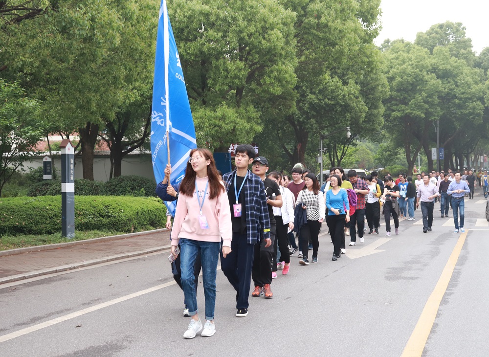 学院教职工在梁林校区田径操场看台下起点集合后,按照健身走路线环梁林校区绕一圈,行程中间设置了三个打卡点(第一食堂门口、学生活动中心、TCL报告厅),教师们打卡后继续行走,最后在终点处梁林校区田径操场看台下签到。