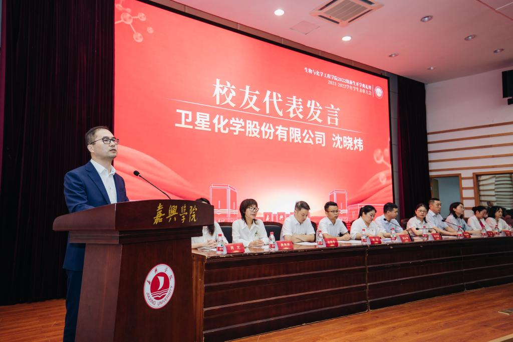 浙江卫星化学股份有限公司副总裁、学院2004届毕业生沈晓玮作为优秀校友代表进行发言。他分享了毕业十八年来自己从大学生到上市公司高级职业经理人的成长故事,强调指出坚持不懈的学习是人生成功必备的条件。他鼓励同学们要敢于吃苦、甘于奉献,尤其是站在人生发展的新起点,要注重学有所长,打好基础;还要注重兼收并蓄,提升能力;更要注重知行合一,加强实践。