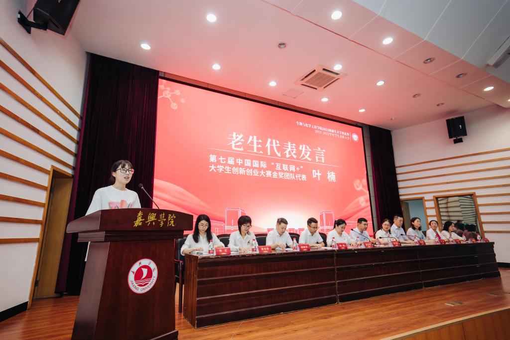 生物222班罗莹、第七届中国国际“互联网+”大学生创新创业大赛金奖获奖团队代表叶楠作为新生、老生代表进行发言,表示将用实际行动践行“请党放心,强国有我”的铿锵誓言,努力争做堪当民族复兴重任的先锋队、突击队、攻坚队。