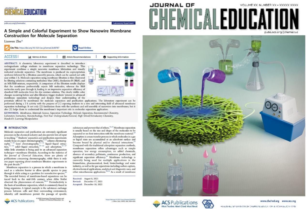 朱连文副教授的教学研究成果“A Simple and Colorful Experiment to Show Nanowire Membrane Construction for Molecule Separation”(论文链接://pubs.acs.org/doi/10.1021/acs.jchemed.3c00787),成果受到审稿人高度评价“I look forward to seeing this article in print. Fantastic job”,并被遴选为当期内封面文章。这是九色视频