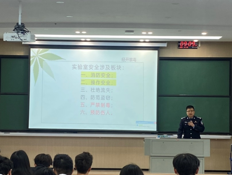 孟警官向在座师生重点讲解了易制毒化学品的消防安全、操作安全、如何杜绝流失及预防伤人等安全管理措施,并通过生动的案例分析、互动等形式深化培训内容。
