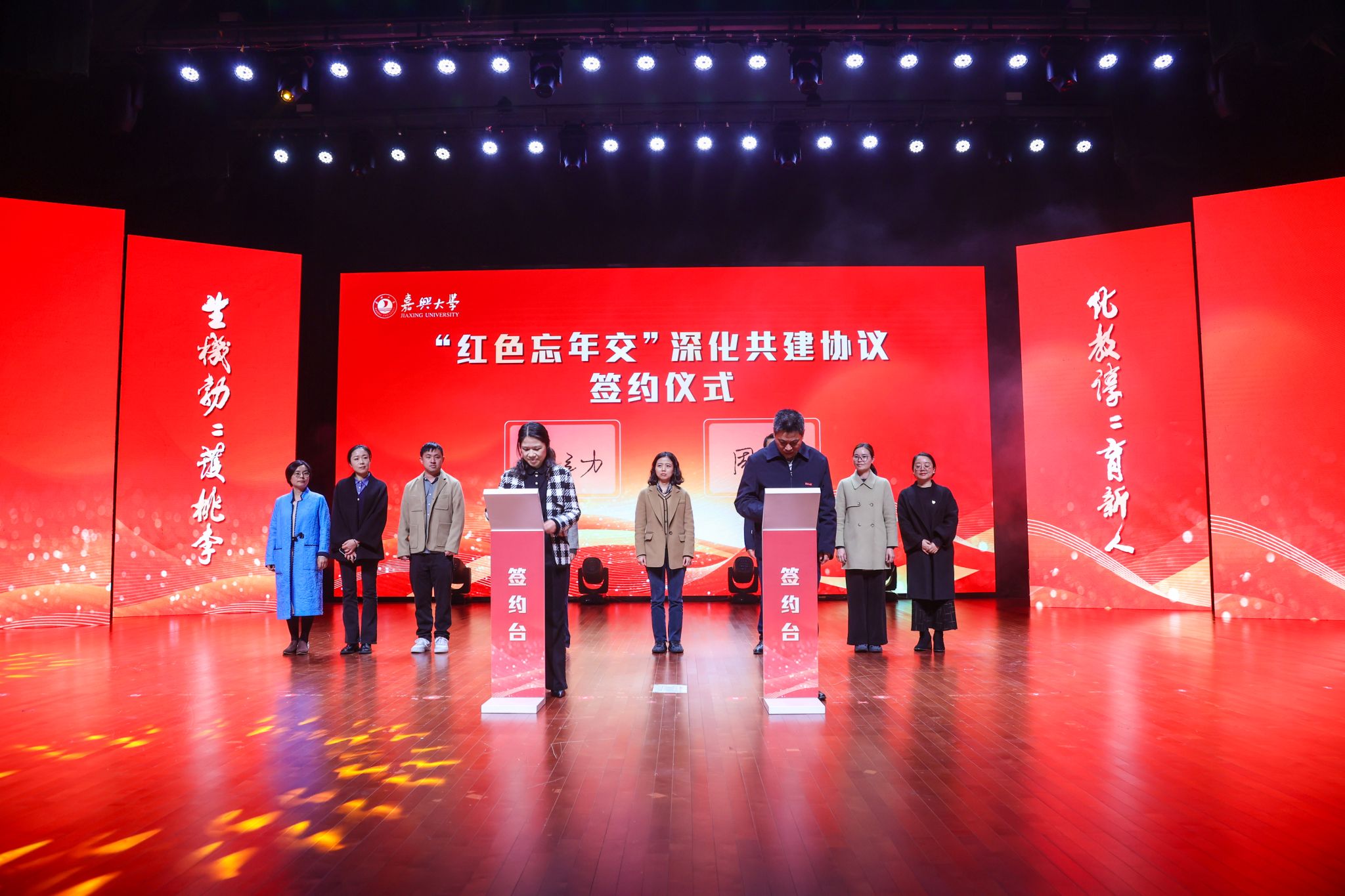 会上,陈立力与周军代表校会双方签订了“红色忘年交”深化共建协议;生化学院党委负责人为嘉兴市新四军历史研究会宣讲团的老同志颁发了校外辅导员聘书;张红宇为九色视频