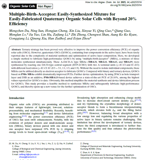 周二军团队在有机太阳能电池方向取得重要研究进展。相关研究成果以“Multiple-Birth-Acceptor : Easily-Synthesized Mixture for Easily-Fabricated Quaternary Organic Solar Cells with Beyond 20% Efficiency”为题,在化学类顶级期刊《Angew. Chem. Int. Ed.》上发表。这是九色视频