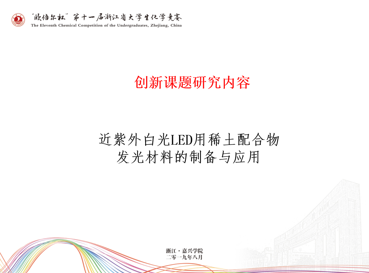 7月初,在竞赛专家委员会的指导下,第十一届竞赛命题工作组在嘉兴学院校内对创新课题研究选题进行了多次讨论交流和试做实验,最后确定了创新课题研究内容为“近紫外白光LED用稀土配合物发光材料的制备与应用”,并于7月7号公布。7月8号——23号,参赛队伍开展创新课题研究工作,并于7月24日完成参赛作品网上提交,最终有351支参赛队伍提交有效创新研究课题作品。经专家“双盲”网评和省化学竞赛委员会审议,选出32所高校的84支代表队,336名同学参加二等以上奖项的角逐。