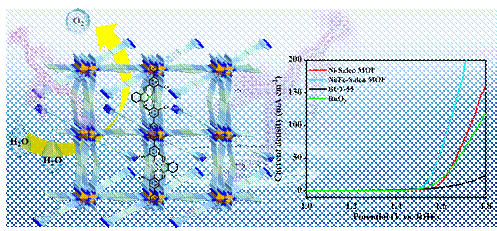 电催化是清洁能源转换领域极具前景的技术,而开发先进的电催化剂是推动该技术发展的关键。在这方面,将金属活性物种引入金属有机框架(MOFs)的有机连接体中,可制备出性能优异的单金属位点电催化剂。本研究开发了一种新型金属-Salen基MOF材料,该材料由螺旋状Zn (II)-吡唑(Zn₆(pyz)₁₂)次级结构单元与金属- Salen配体以罕见的不完全连接形式自组装而成。相较于卟啉或酞菁类MOF材料的闭环四齿 MN₄结构,该MOF配体中的开环四齿 MN₂O₂配位结构能够为反应物的吸附与活化提供更大的几何空间。此外,Salen配体强大的螯合作用比双齿联吡啶配体更能有效稳定金属中心。在电催化析氧反应(OER)性能测试中,与缺乏金属配位点的BUT-55吡唑型MOF材料相比,所制备的 Ni-Salen MOF表现出更优异的催化性能。通过部分替换Ni为Fe构建的Ni/Fe-Salen MOF,不仅其析氧反应活性优于商用二氧化钌(RuO₂),还实现了良好电催化稳定性。密度泛函理论(DFT)计算结果表明,两种金属- Salen MOF 催化剂在析氧反应中的速率决定步骤存在差异,而Ni/Fe-Salen MOF具有更低的反应能垒。