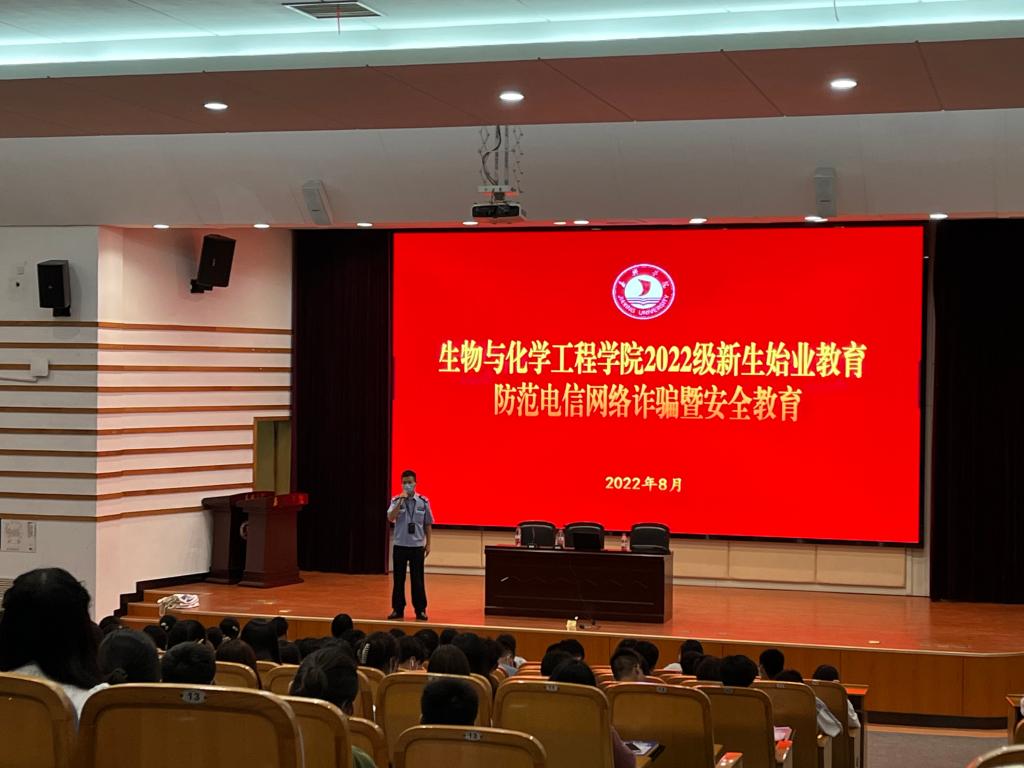 8月25日晚,生化学院在TCL报告厅组织开展2022级新生始业教育之安全教育,邀请城南派出所张秋江警官进行反诈防骗专题教育。