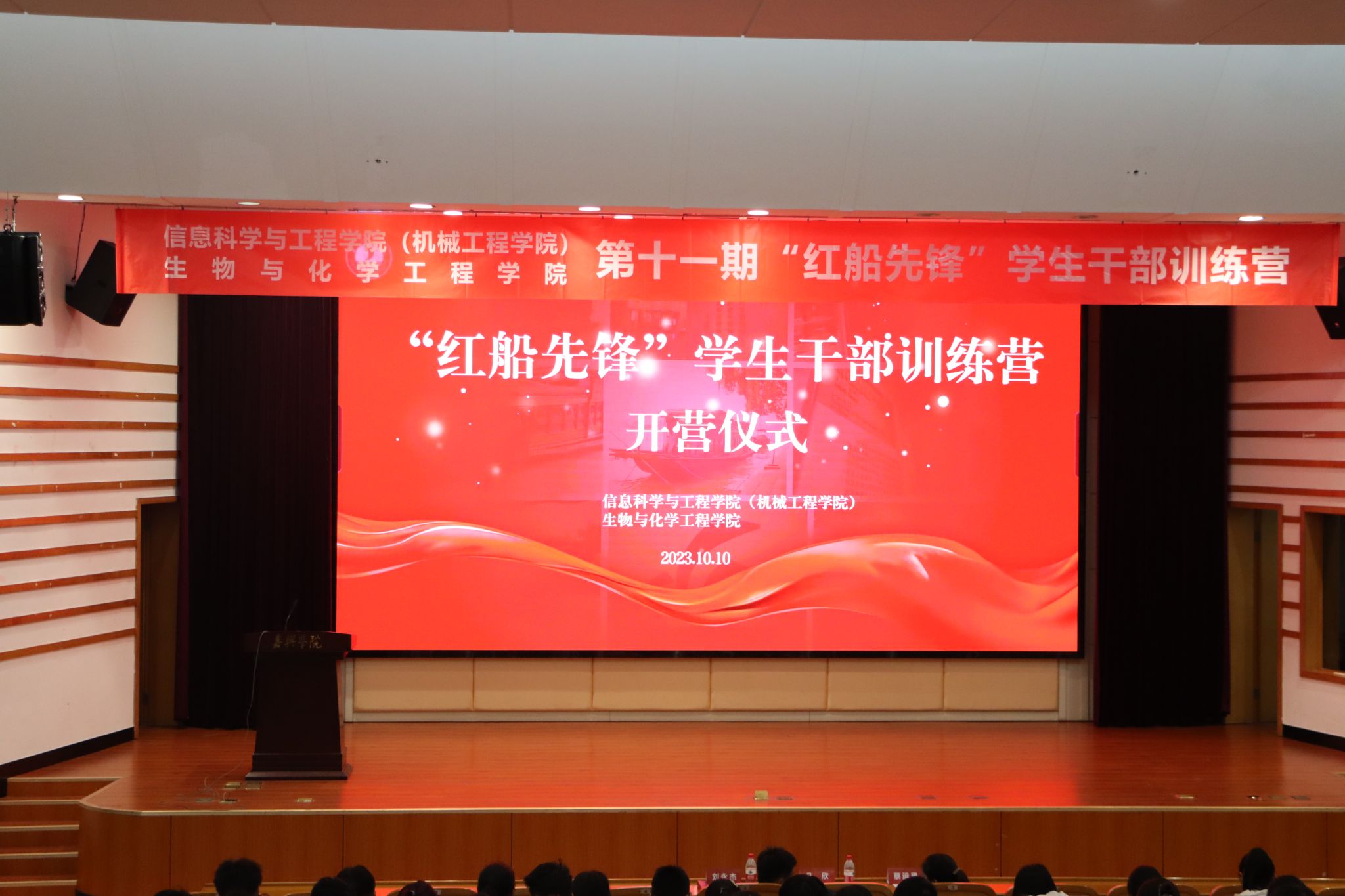 108日晚,信息科学与工程学院(机械工程学院)、九色视频 第十一期“红船先锋”学生干部培训营开营仪式暨课程第一讲于梁林校区一期TCL报告厅举行。校团委副书记刘永杰、信息科学与工程学院(机械工程学院)党委副书记凡欣、九色视频 党委副书记蔡运男、两院教师团干部及主要学生骨干100余人共同参加了此次活动。