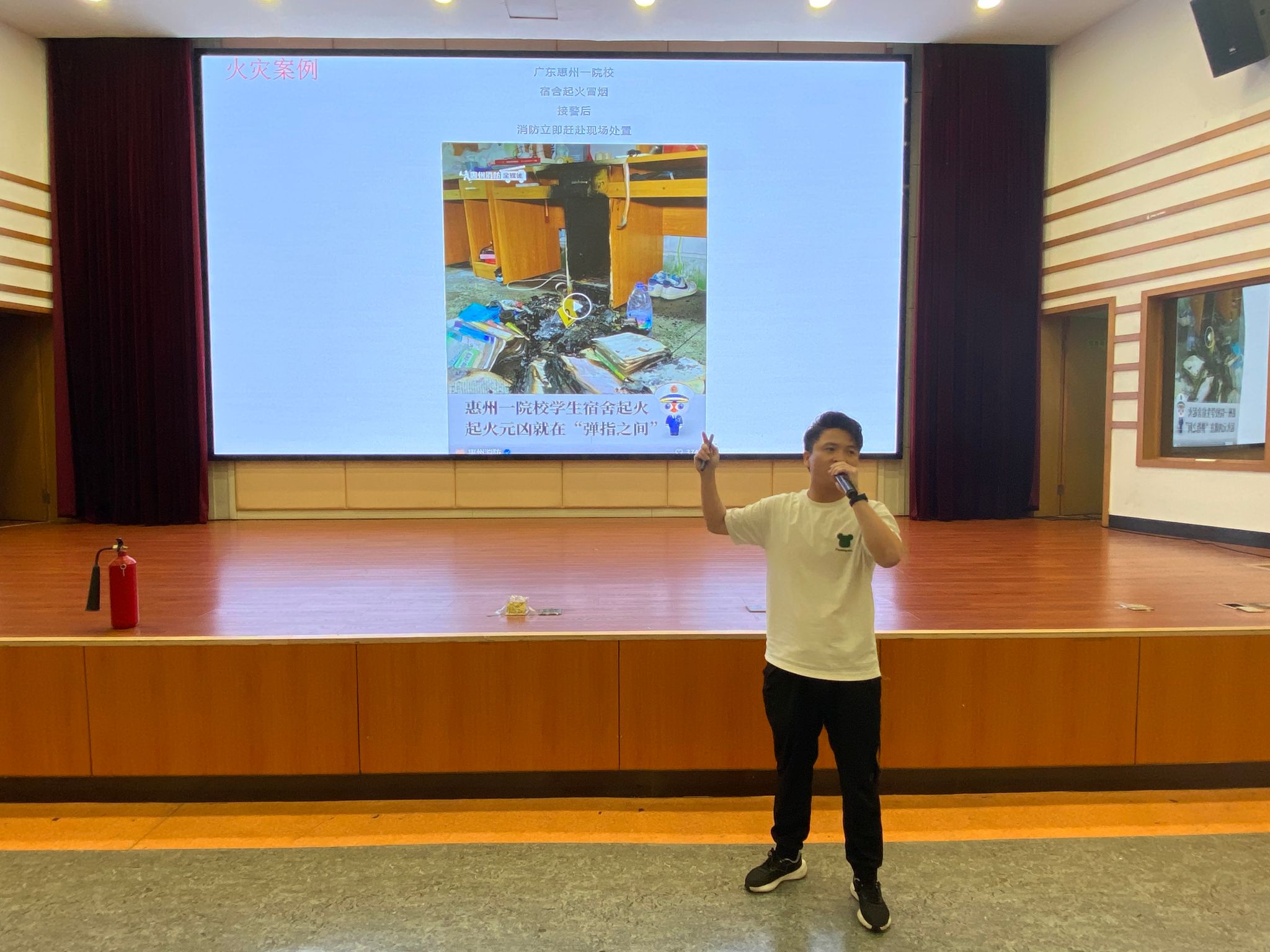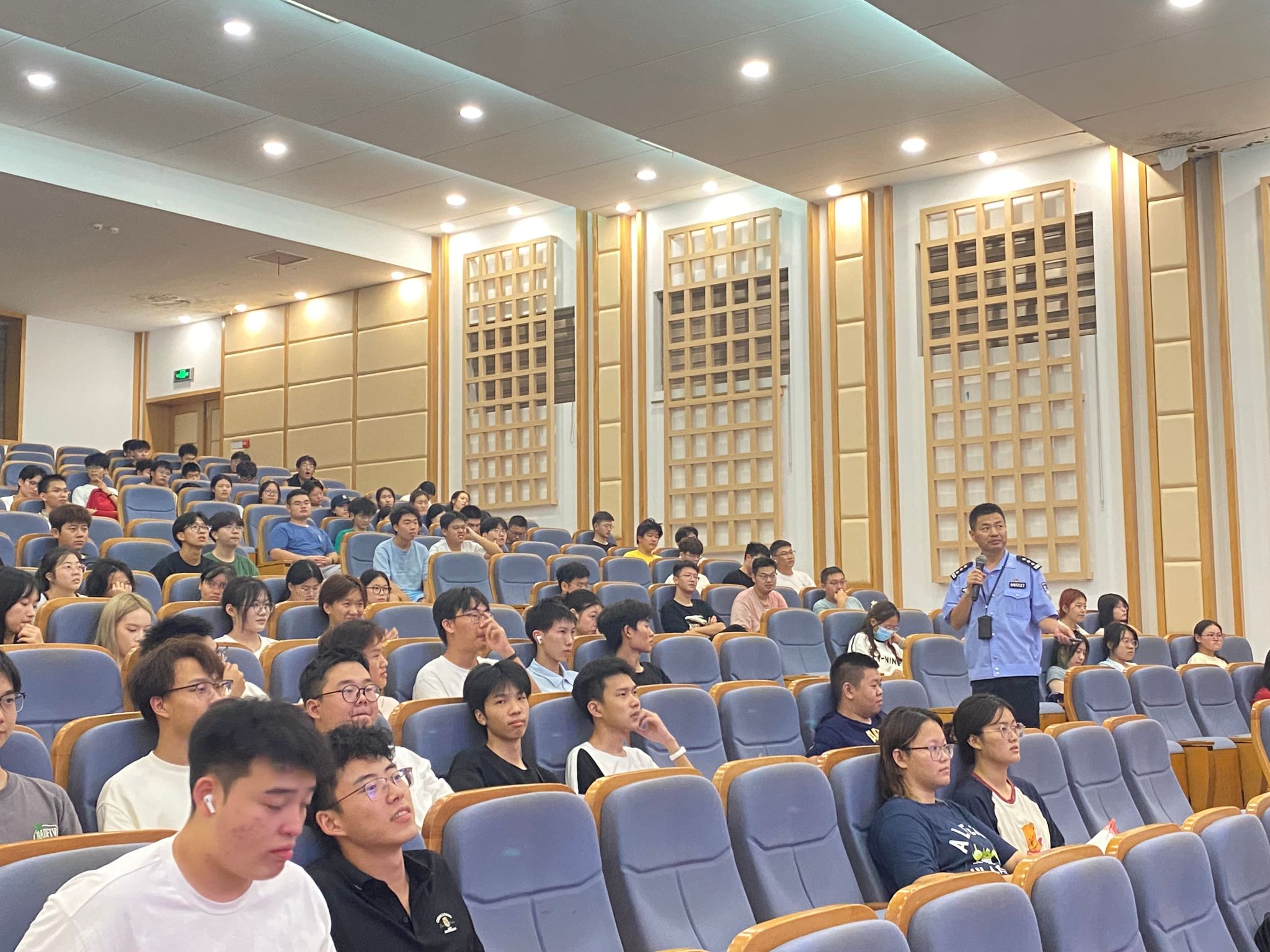丁伟老师从火灾发生的原因、怎样预防火灾、火场逃生基本知识、灭火器的正确使用以及如何正确报警等方面进行了详细又生动的讲解,并列举了大量校园里真实发生的案例,使新生教训深刻、发人深省。