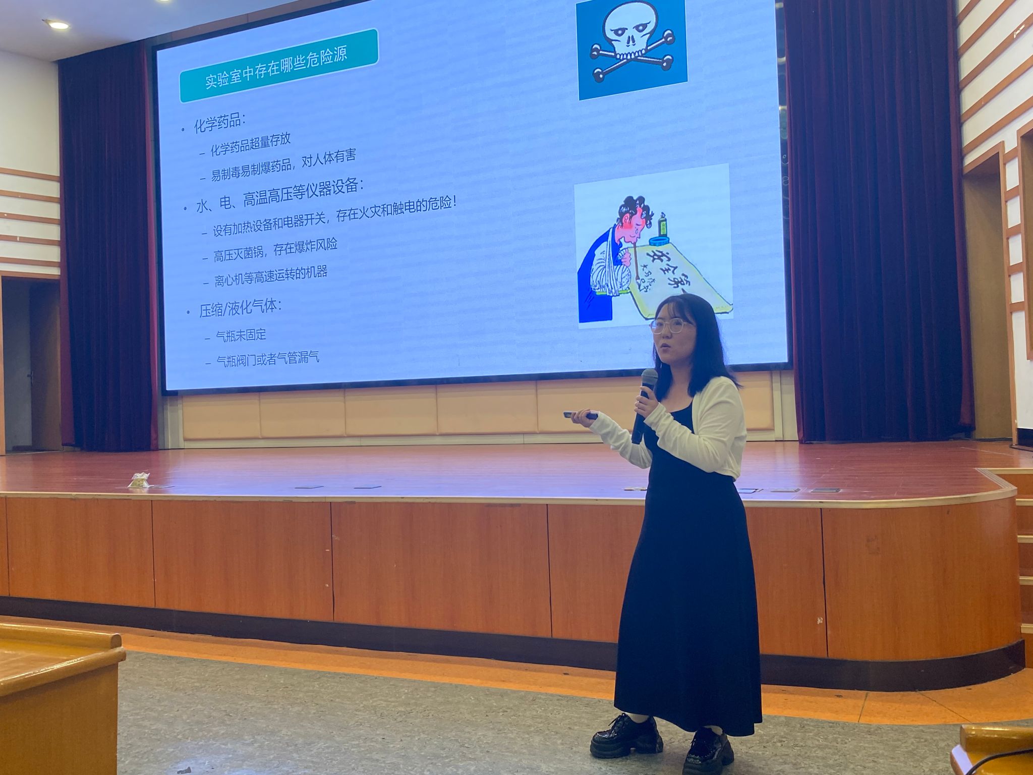 麻泽宇老师以实验室安全事故案例为切入点,从防火防爆、危化品使用、安全用电、仪器设备使用等方面详细介绍了实验室安全相关知识、实验室应急应变指南和实验室规章制度等内容,告知同学们一定要严格遵守实验室的规章制度,养成良好实验习惯。