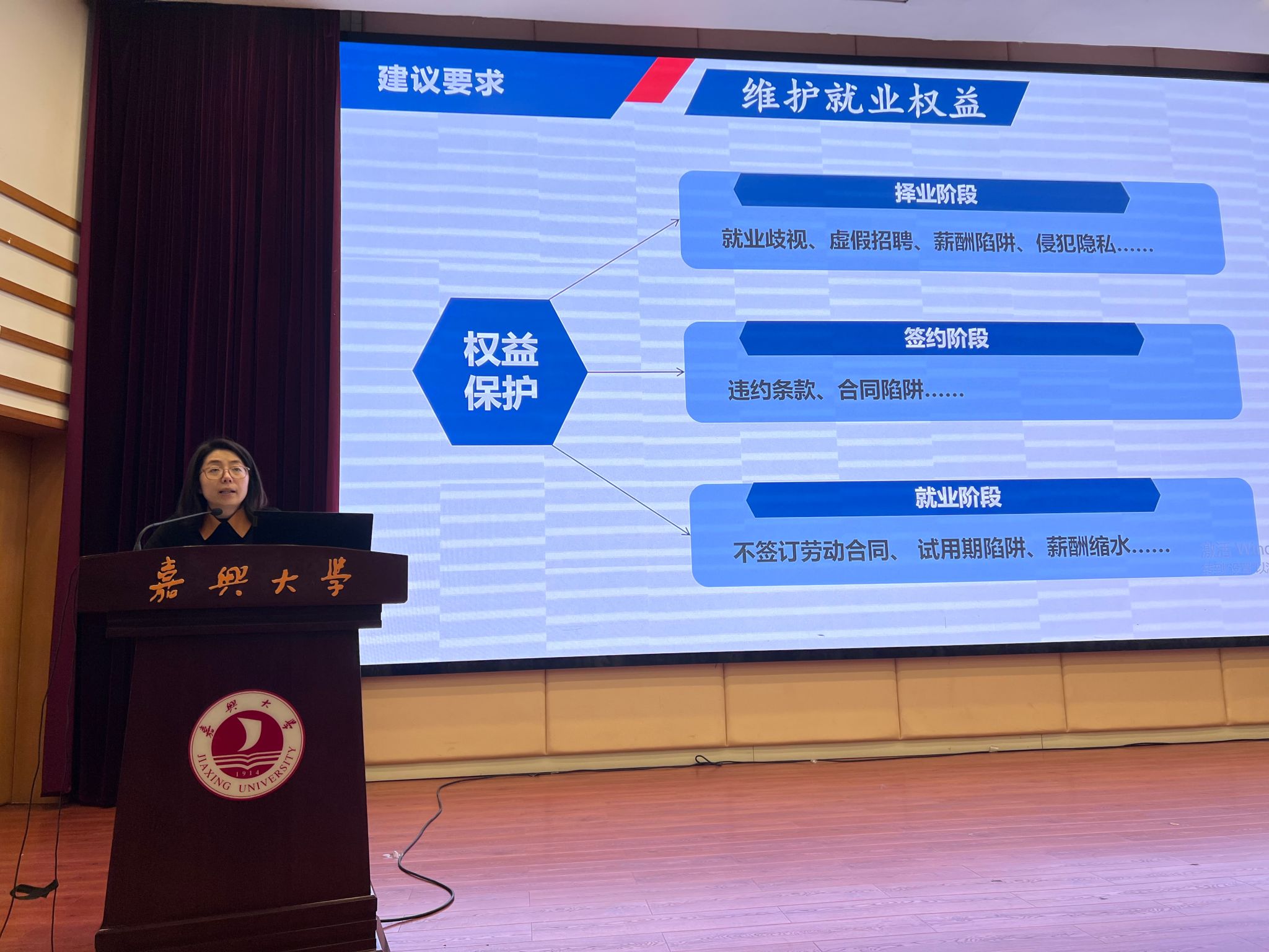 就业辅导员潘佳豪为同学们讲解了就业时间节点安排、就业程序手续、就业过程中的注意事项,并对就业签约档案派遣等重要环节需要注意的问题进行了指导。